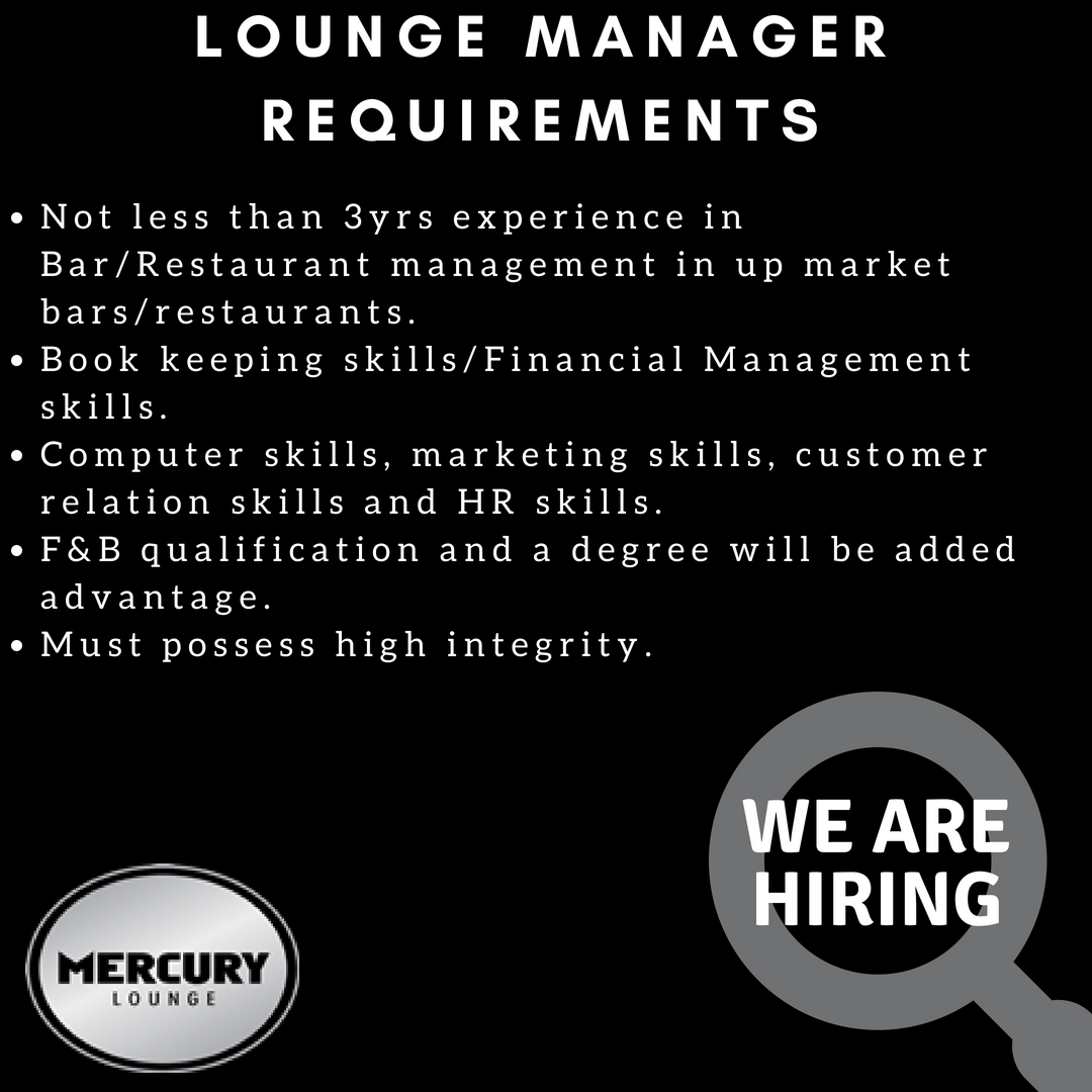 Email them a cover letter, a detailed CV and copies of recommendation letters from your previous employer(s) through careers@mercurylounge.co.ke.