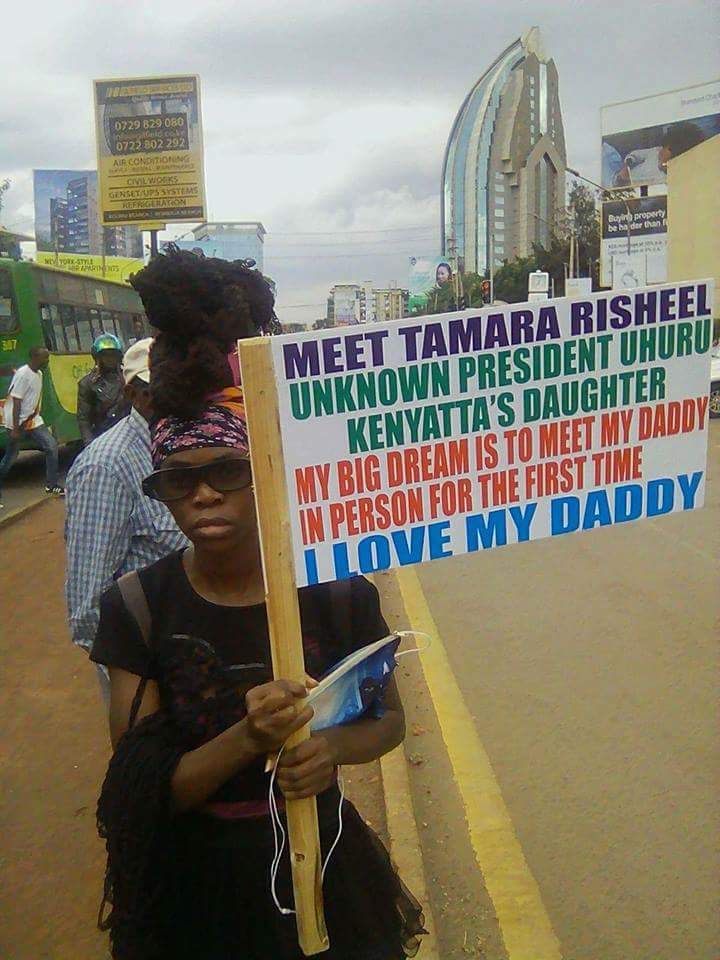 A lady Tamara Risheel claims to be unknown @UKenyatta daughter and wants to meet her daddy for the first-time. She's seen walking around with a placard here around Kilimani. pic.twitter.com/x5pikFPbVx